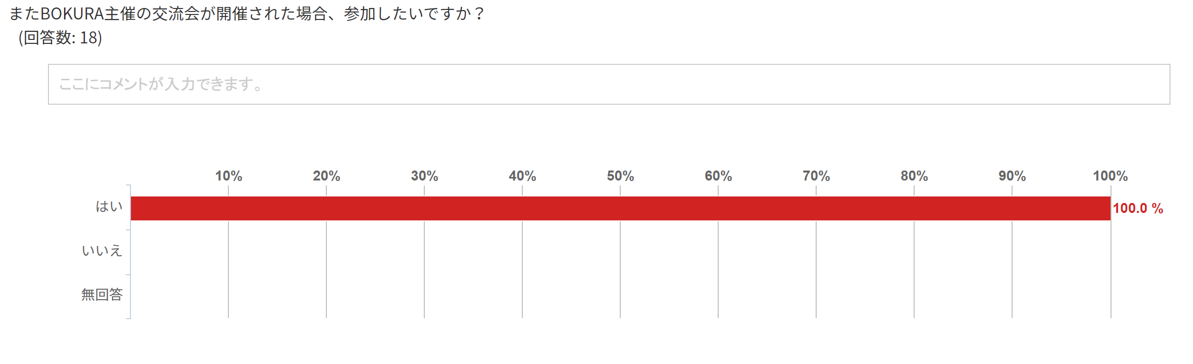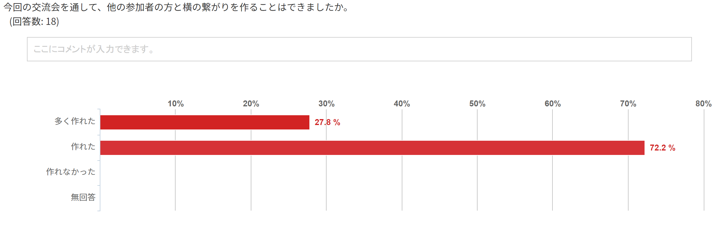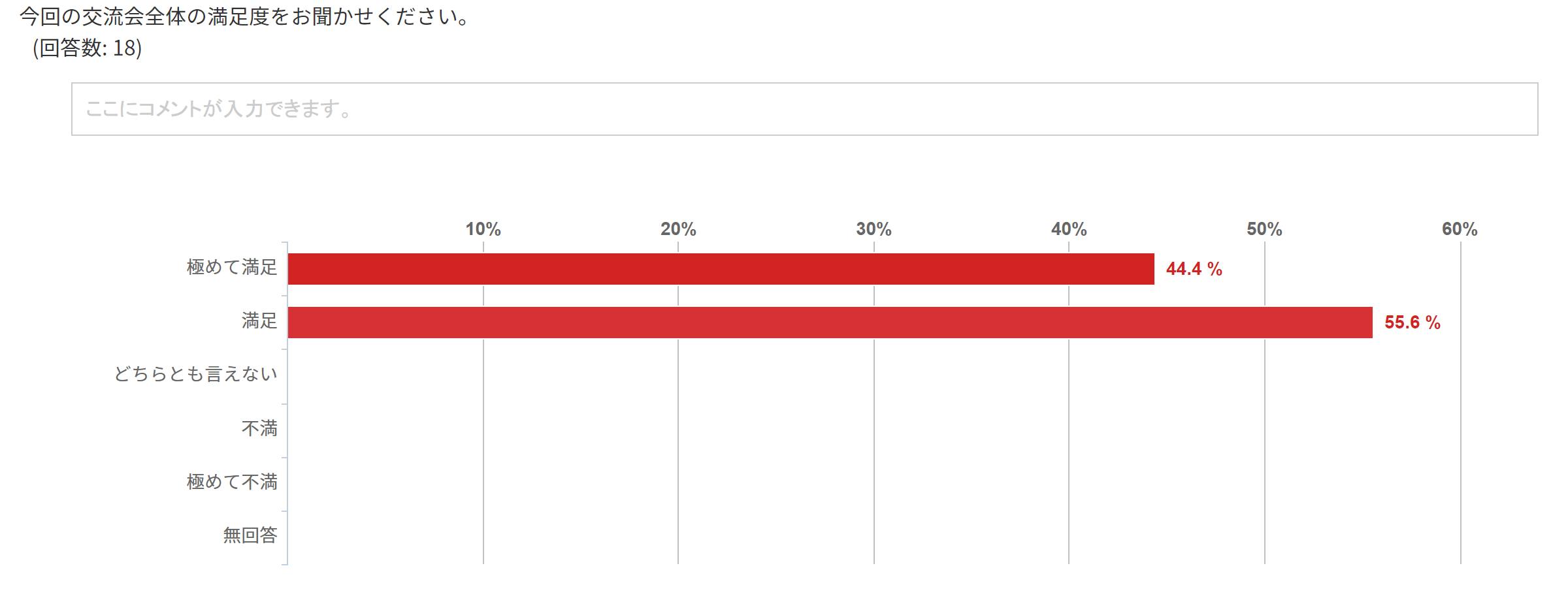 実施後のアンケートでは、ご参加いただいた皆様が横のつながりが出来たと回答、イベントの満足度についても非常に高い評価となりました。