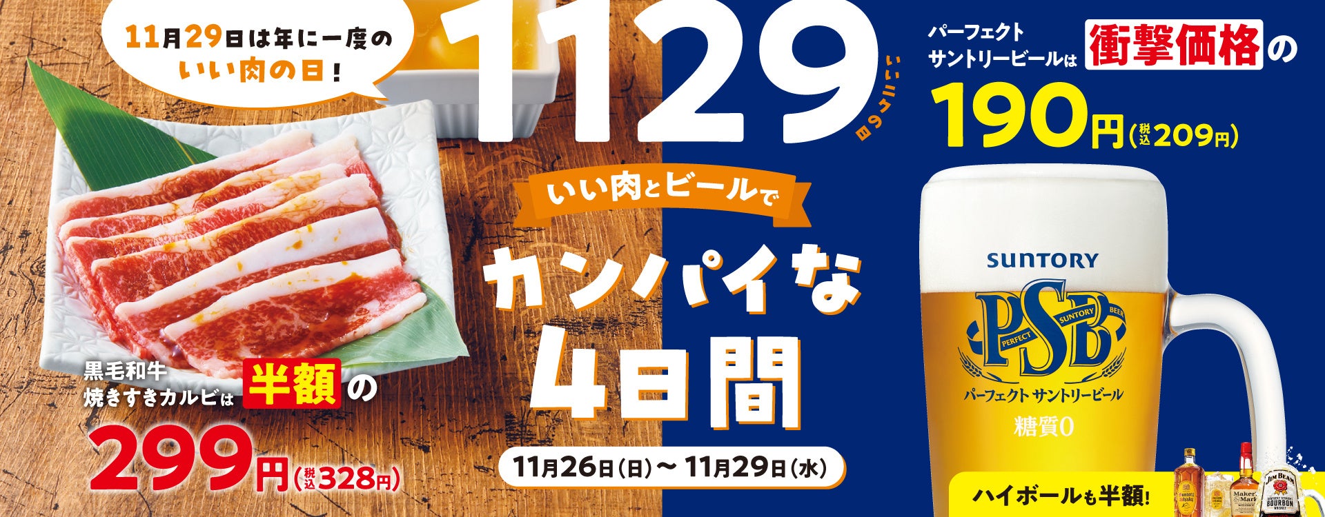 「焼肉の和民」ではこの度、年一度の「いい肉の日」ということで2023年11月26日(日)~11月29日(水)までの4日間において、毎月29日恒例の「ニクの日」対象商品の「黒毛和牛焼きすきカルビ」を「ニクの日」同様、通常価格の半額となります1皿299円(税込328円)でのご提供に加え、焼肉との相性抜群の「パーフェクトサントリービール」を1杯190円(税込209円)でご提供いたします。