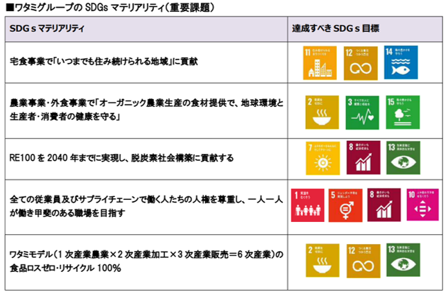 ワタミは2019年10月にSDGs推進本部を設立し、本業の中でSDGsに取り組むために、各事業本部から選出したメンバーによる社内組織横断タスクフォースチームを組織しました。2020年にタスクフォースチームによりワタミが取り組むSDGsマテリアリティ(重要課題)を特定して、KPI(中間目標)・KGI(2030年目標)を立て、目標達成のために組織横断で推進して事業活動のなかで実践しています。