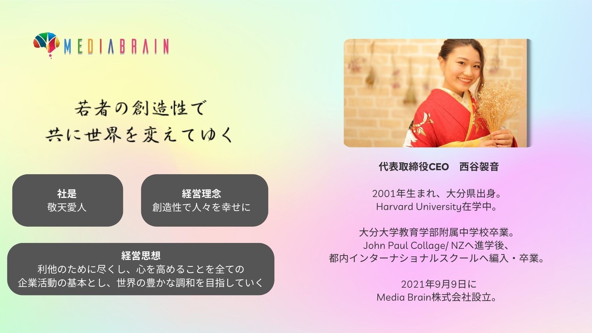Media Brain株式会社は、2021年に現役ハーバード大学生の弊社代表、西谷が「創造性で人々を幸せに」という経営理念の基、創業・設立されました。その原点は、代表自身が高校時代から、海外にて過ごしてきたバックグラウンドや、ハーバード大学による国際会議(Harvard Project for Asia and International Relations)にアジア代表として選抜された経験に基づきます。それらの経験の中で、日本をはじめ、各国の同世代と未来の政治・経済・社会問題などについて議論を通じ、同じ ”Z世代 ”でありながらも、国ごとによって考え方や価値観が全く異なるという気づきがありました。