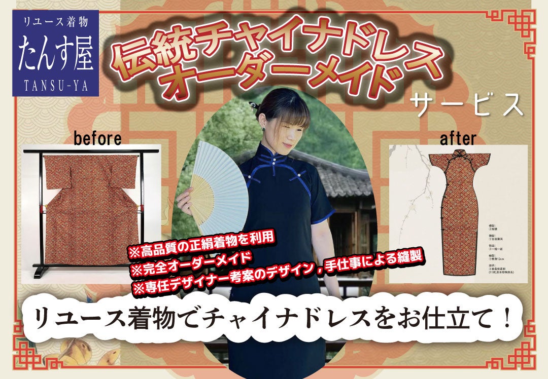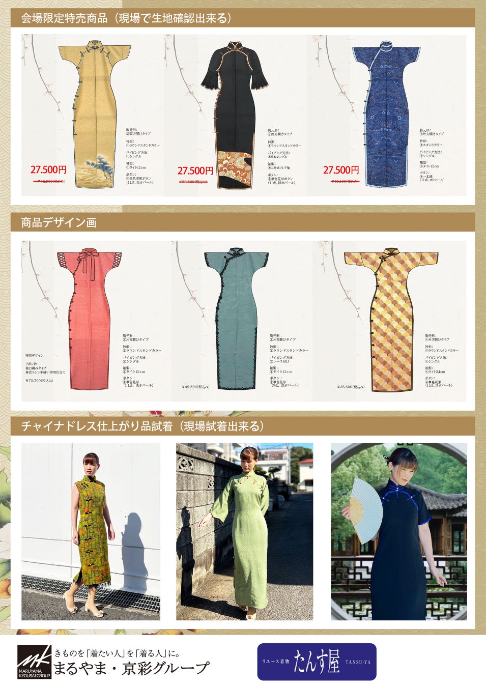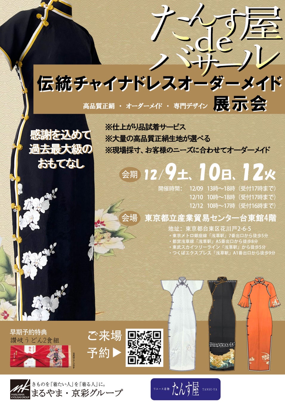 チャイナドレスお仕立てサービスについて、2023年12月9日(土)~12日(火)に開催の着物イベント「たんす屋deバザール」にて初展示いたします。実物を展示いたしますので、ご興味あるかたはぜひご来場ください。