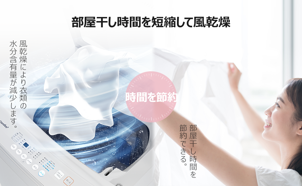 この洗濯機は、ヒーターを使用しない風乾燥機能を備えています。この機能は、脱水槽の遠心力と通風口から取り込んだ空気で衣類の水分を高速に除去します。ヒーターを使用しないので、電気代を節約できます。また、衣類にダメージを与えないので、長持ちさせることができます。風乾燥機能は、部屋干しの乾燥時間を大幅に短縮できます。湿気の多い季節や天気の悪い日でも、すぐに乾いた衣類を着ることができます。