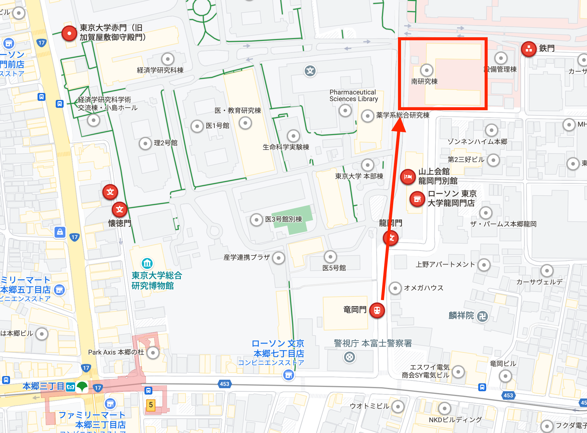 東京大学竜岡門から入り、直進すると右手に南研究棟がございます。外観画像の建物がございますので、こちらを参考にお越しください。