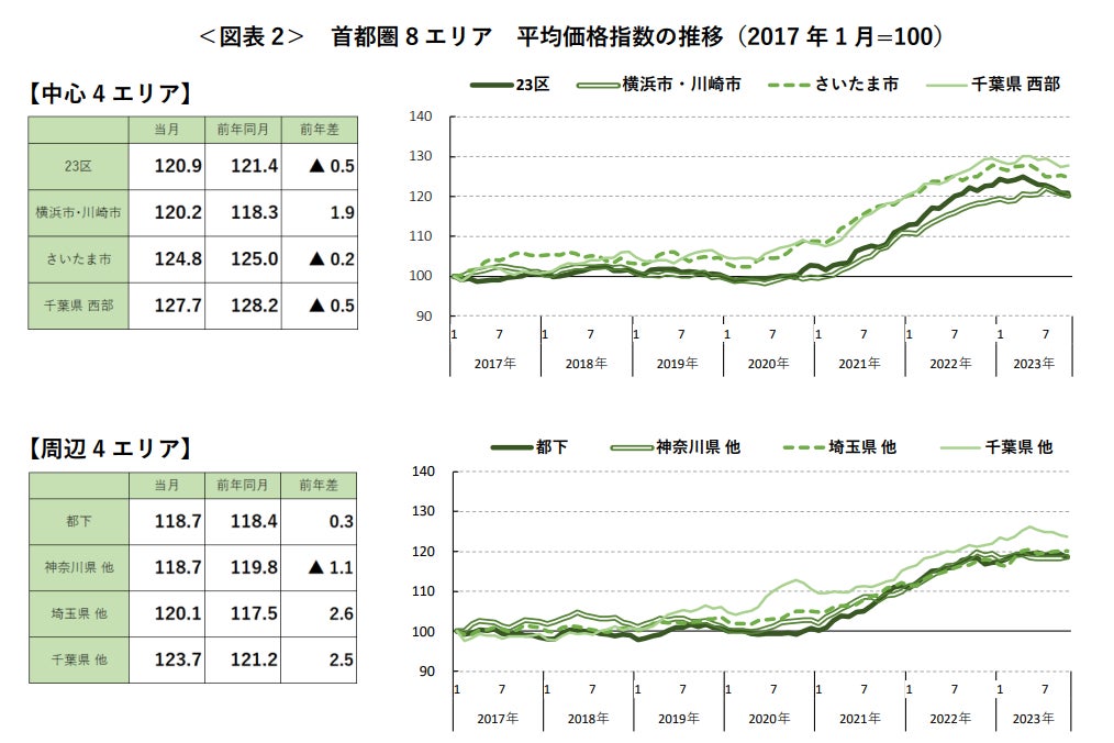 エリア別の前月比では横浜市・川崎市が3カ月連続、千葉県他が5カ月連続で下落した。また、前年同月比は神奈川県他が36カ月ぶり、千葉県西部が45カ月ぶりに前年同月割れとなるなど4エリアが前年同月を下回り、首都圏全体で価格の伸びの鈍化、または下落傾向が見られる。
