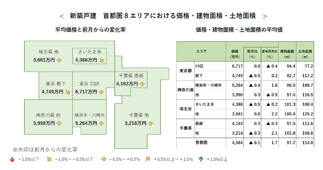 首都圏の新築戸建の平均価格は4,564万円で、前月比-0.1%と3カ月連続で下落。