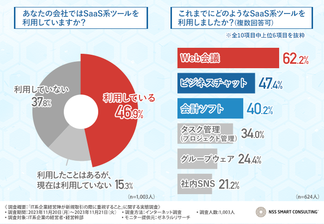 およそ半数の企業で利用されるSaaS系ツール。主な利用ツールは「Web会議」「ビジネスチャット」