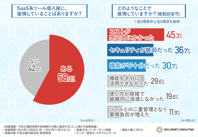「SaaS系ツール導入後に、後悔していることはありますか?」と質問したところ、およそ6割の方が『ある(58.0%)』と回答しました。