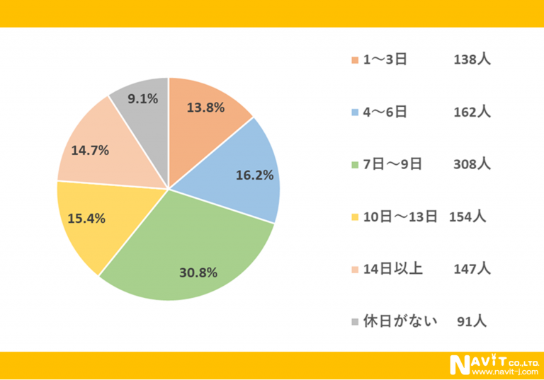 1ヶ月あたりの休日日数は、「7~9日」が最多