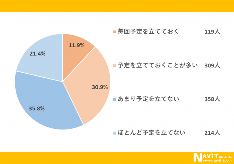 「毎回予定を立てておく」と「予定を立てておくことが多い」を合わせると、42.8%の人が予定を立てていることが分かりました。