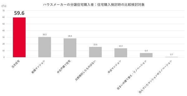 住宅購入時の比較検討対象を調査したところ、「ハウスメーカーの分譲住宅」購入者は59.6%が「注文住宅」と比較検討をしていることが分かりました。(図7)