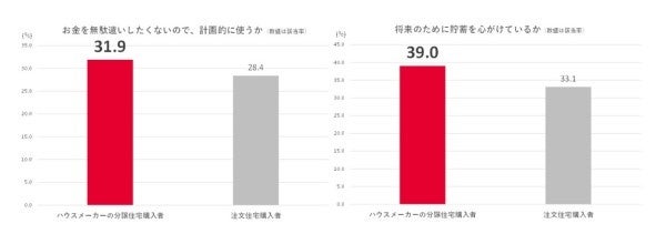 「注文住宅」購入者と比較すると「ハウスメーカーの分譲住宅」購入者は、自身の買い物やお金に関する価値観について、“お金を無駄遣いしたくないので、計画的に使う”、“将来のために貯蓄を心がけている”等、と回答する割合が多く倹約傾向があると考えられます。(図8)