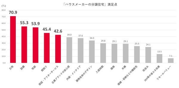 「ハウスメーカーの分譲住宅」の満足度TOP5は、立地(70.9%)、設備(55.3%)、性能(53.9%)、間取り