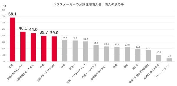 性能(39.7%)、企業ブランドの安心感(39.0%)と現実的なものから「ハウスメーカーの分譲住宅」ならではの結果に