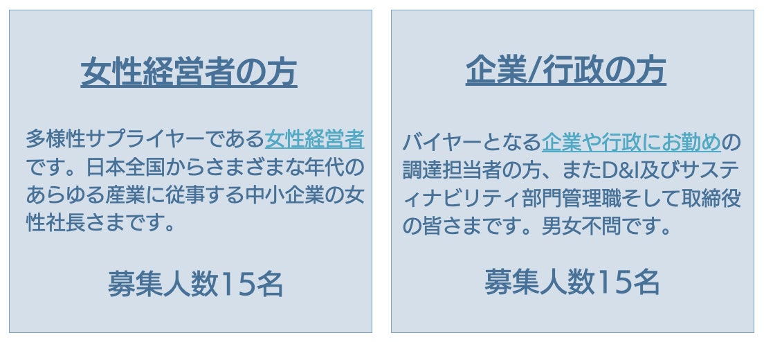 次にバイヤーとなる企業や行政にお勤めの調達担当者の方、またD&I及びサスティナビリティ部門管理職そして取締役の皆さまです。男女不問です。募集人数は同数の15名です。