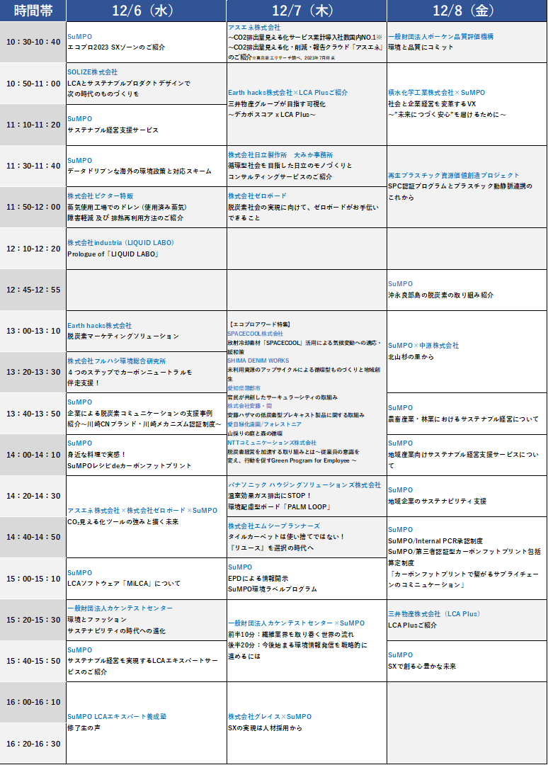 今回エコプロ展においてSuMPOは、SX(サステナブル・トランスフォーメーション)ゾーン(23社で構成)の一体的運営とともに、「心豊かな未来」を実現するためのSuMPOの各種サービスのご紹介と、ゾーン出展各社と共創の取組について各種プレゼンを実施します(東京ビックサイト 東4ホール、ブース番号:4-047)。ぜひお誘い合わせの上、ご来場ください。