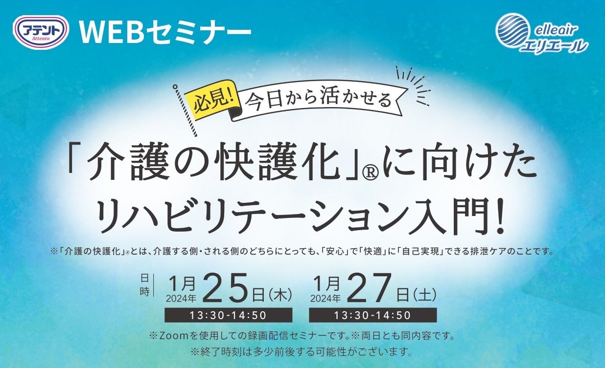 今回の調査結果を受け、当社初めての取り組みとして東京家政大学 清水順市先生を講師に招き、“高齢者のリハビリテーション”をテーマにしたWEBセミナーを2024年1月25日(木)・27日(土)に開催します。本セミナーは、病院・介護施設の職員を対象とし、リハビリの基本知識や課題改善のポイントをご紹介します。また、高齢者の皆さまがリハビリに集中していただけるように病院・施設用『アテント Rケア うす型さらさらパンツ』、『アテント Rケア うす型スーパーフィットパンツ』を用いた排泄ケアをご提案します。これからも「アテント」では、介護する側・される側どちらにとっても「安心」で「快適」に「自己実現」できる「介護の快護化」に向けた排泄ケアをめざしていきます。
