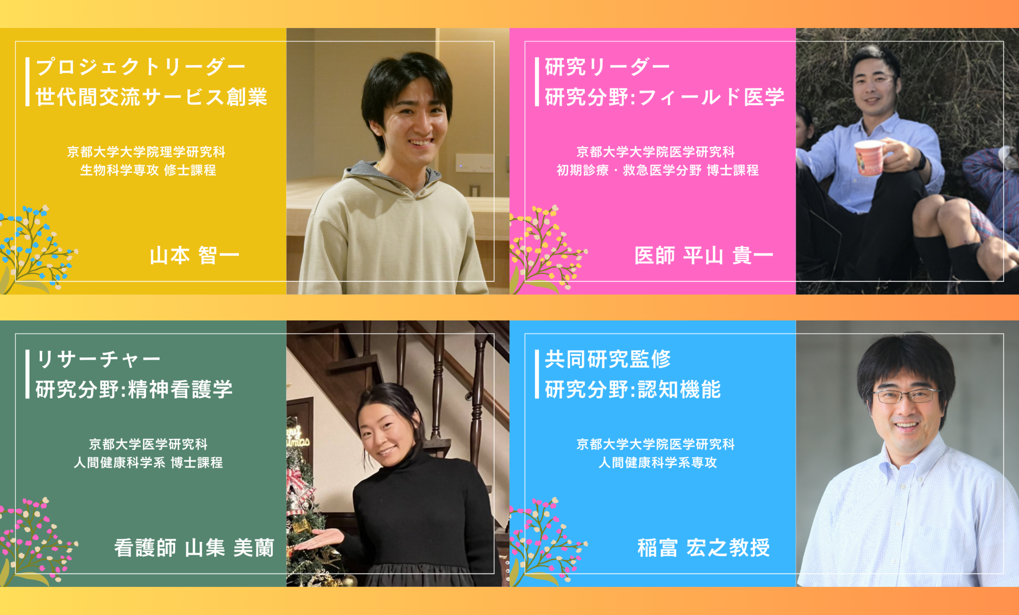 今回の研究では、世代間交流が及ぼす若者への影響を調べるべく、京都大学理学研究科修士の山本智一、京都大学大学院医学研究科人間健康科学系専攻教授の稲富 宏之、京都大学の世代間交流のフィールドワークを行う博士課程の平山 貴一さん、看護師兼京都大学医学研究科博士課程の山集美蘭さんと共に研究を進めていきます。