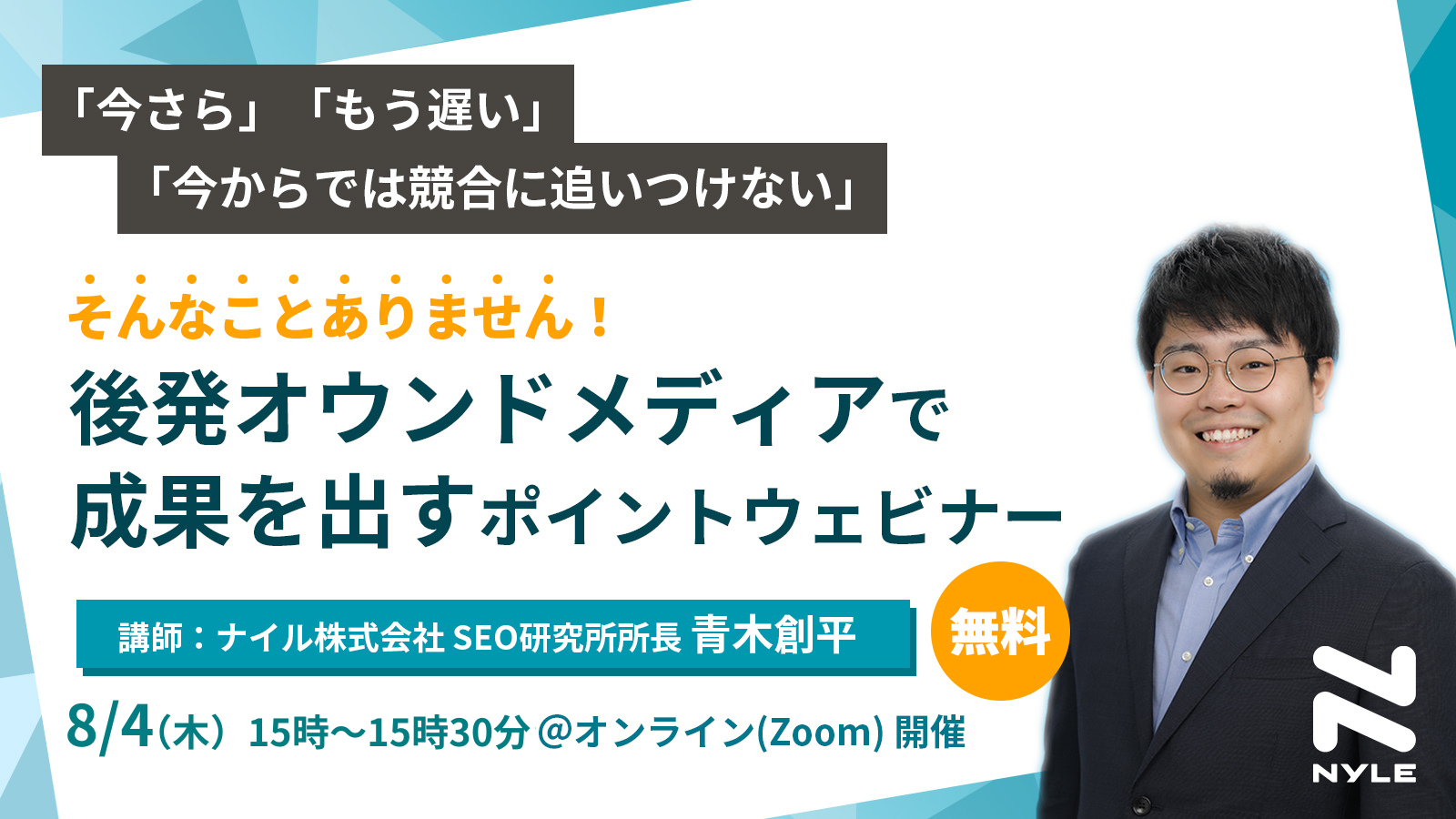 オウンドメディアとは、ユーザー接点やブランディングなどを目的に、自社で管理するメディアのことを指します。オウンドメディアは、しっかりと目的を設定して運用すれば、認知拡大やリード獲得、売上貢献にも繋がります。そのため、すでに多くの企業がオウンドメディアを運用しており、「今さらオウンドメディアをやっても、競合に勝てないのでは…」と思う方もいるのではないでしょうか?そんな中、ナイルではオウンドメディアの立ち上げや、更新されていない既存メディアを支援し、セッション数を大きく伸ばしコンバージョンを増やすことに成功しています。なぜ、後発の方が成果を出せるのか?オウンドメディアで成果を出すポイントをお伝えするウェビナーを開催いたします。