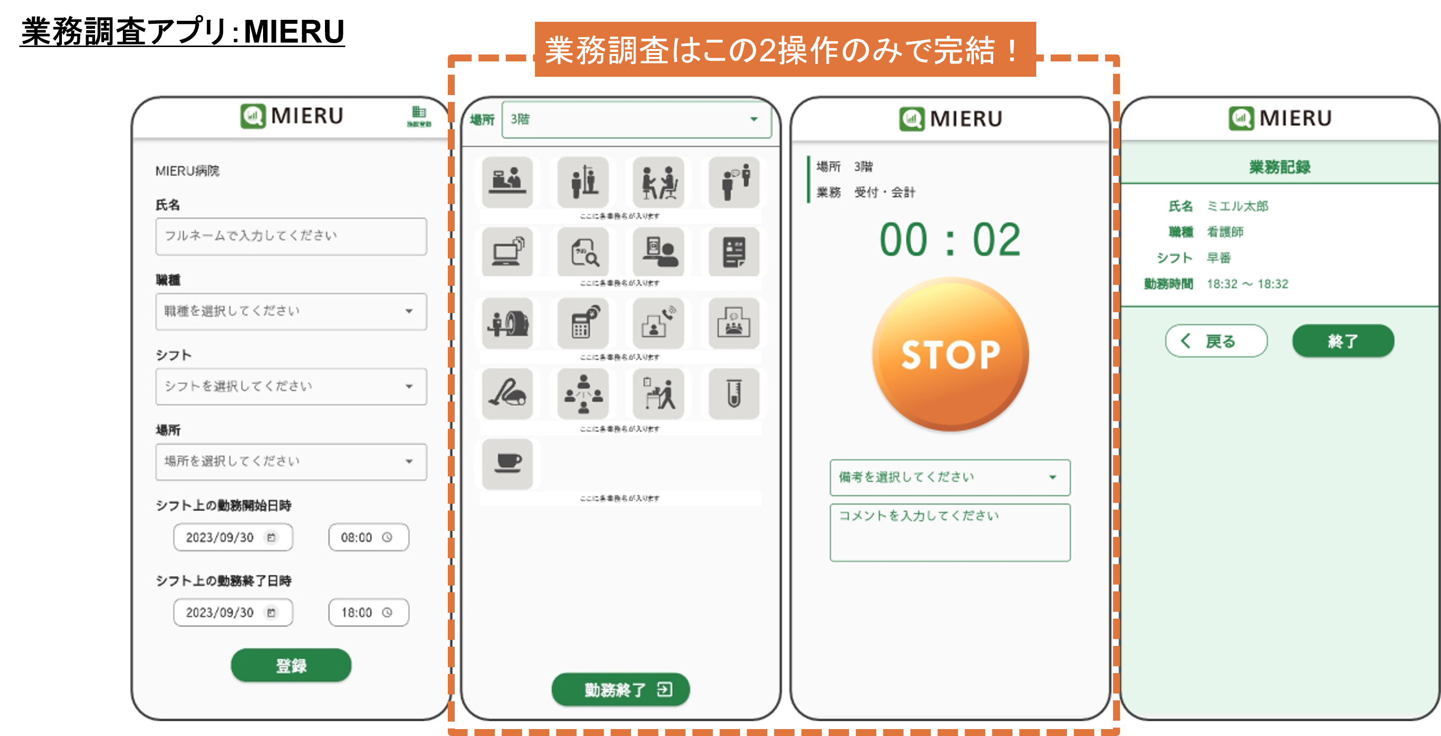 自社開発業務調査アプリ「MIERU」を用いた業務量の見える化を行います。