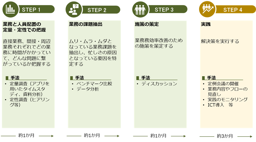一般的には、約6ヶ月間で、業務と人員配置を定量・定性で把握し、業務課題を抽出した上で、改善施策の提案、実践開始まで支援します。