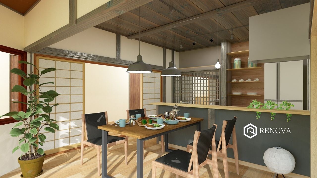 もともとの和造りのデザインを活かし、南側の和室2間を広々としたLDKに。既存の建具をふんだんに再利用し、ほっと落ち着く和レトロな空間に仕上げています。
