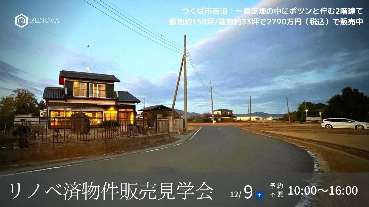 場所は、つくばエクスプレス「研究学園駅」から車で25分、首都圏からも車で約1時間ほどでアクセスできるつくば市吉沼。日本百名山に数えられる筑波山を望め、一面芝畑の中にポツンと佇む贅沢なロケーションの2階建てリノベーションハウスです。