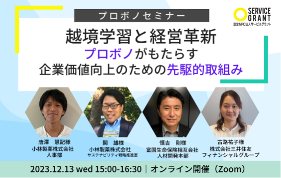 【人材開発・人事】【経営企画】【サステナビリティ企画】、登壇者それぞれの視点から、実際の企業でのプロボノの取り組みのチャレンジや手応えなどを伺います。