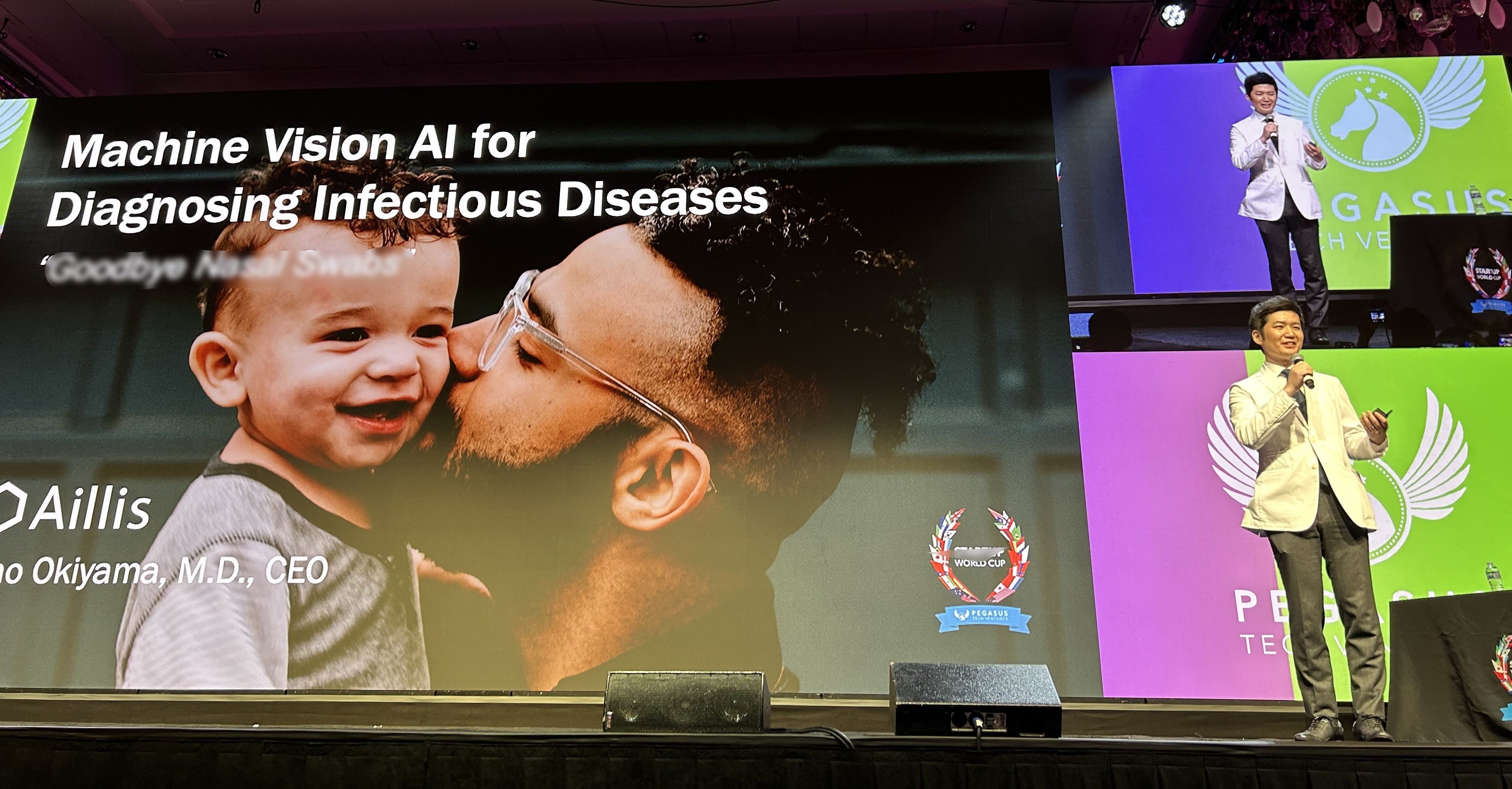 11月29日に行われた世界大会準決勝を勝ち抜いた10社が12月1日にファイナリストとして決勝大会に登壇し、代表取締役の沖山翔は、AIを活用し感染症診断の未来を切り開くスタートアップとして、AI医療機器nodoca®の開発や将来への展望についてのプレゼンテーションを行いました。