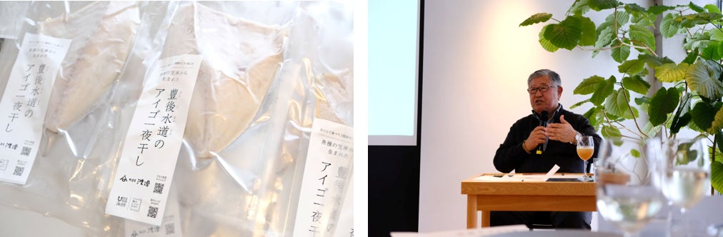 そして2022年、おいしく食べることで「磯焼け」を減少させ、豊かな海の未来につなげていくことを目的とした「豊後水道のアイゴの一夜干し」を共同開発。渡邉会長は値のつかない「アイゴ」を、水揚げされた全量買い取ることからスタートし、地元漁業者たちからの信頼を得るまで地道に取り組んだエピソードなど開発から現在までの歩みを語り、また「アイゴ」だけでなく海の温暖化が加速することで起こりえる問題を伝え、魚食文化を守るためにすでに取り組んでいるプロジェクトの数々を紹介。一つひとつでも私たち消費者ができることを伝え、参加者も熱心に耳を傾けました。