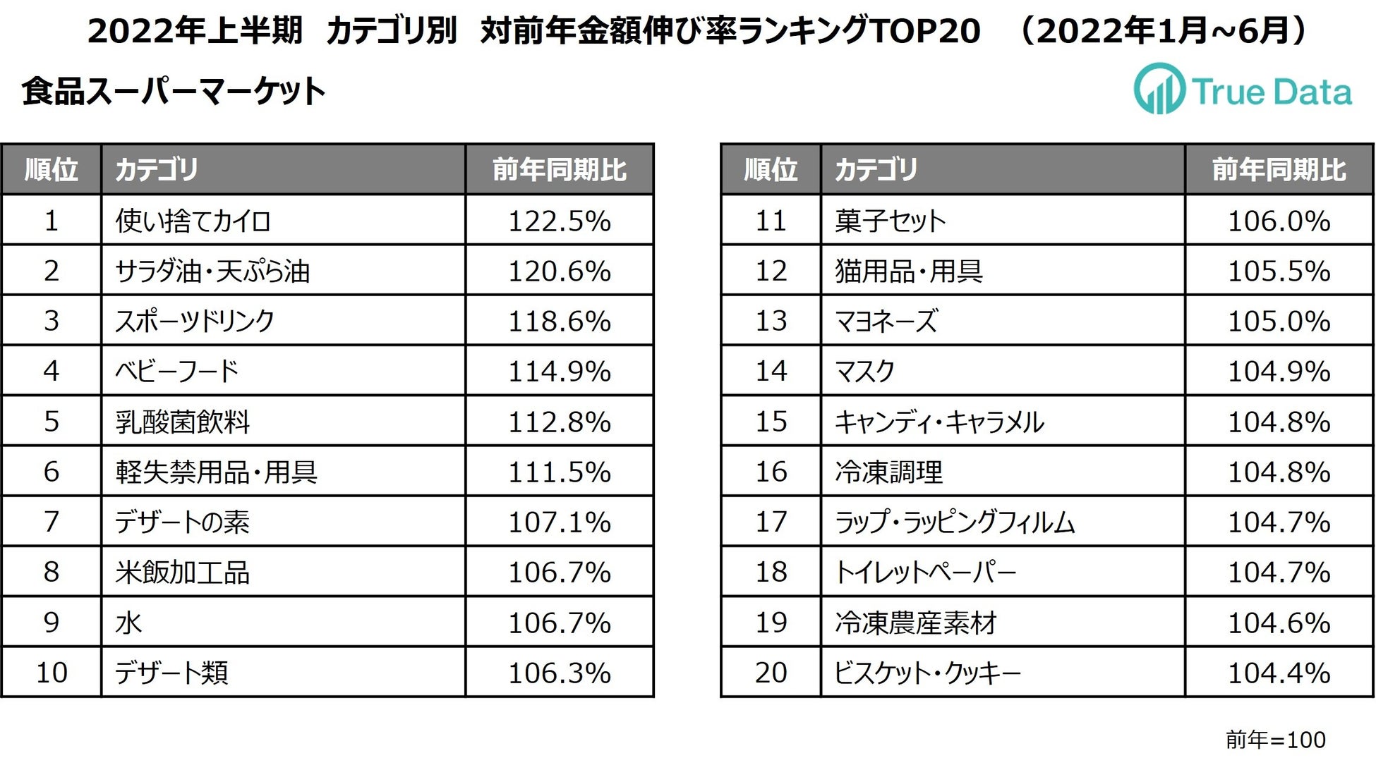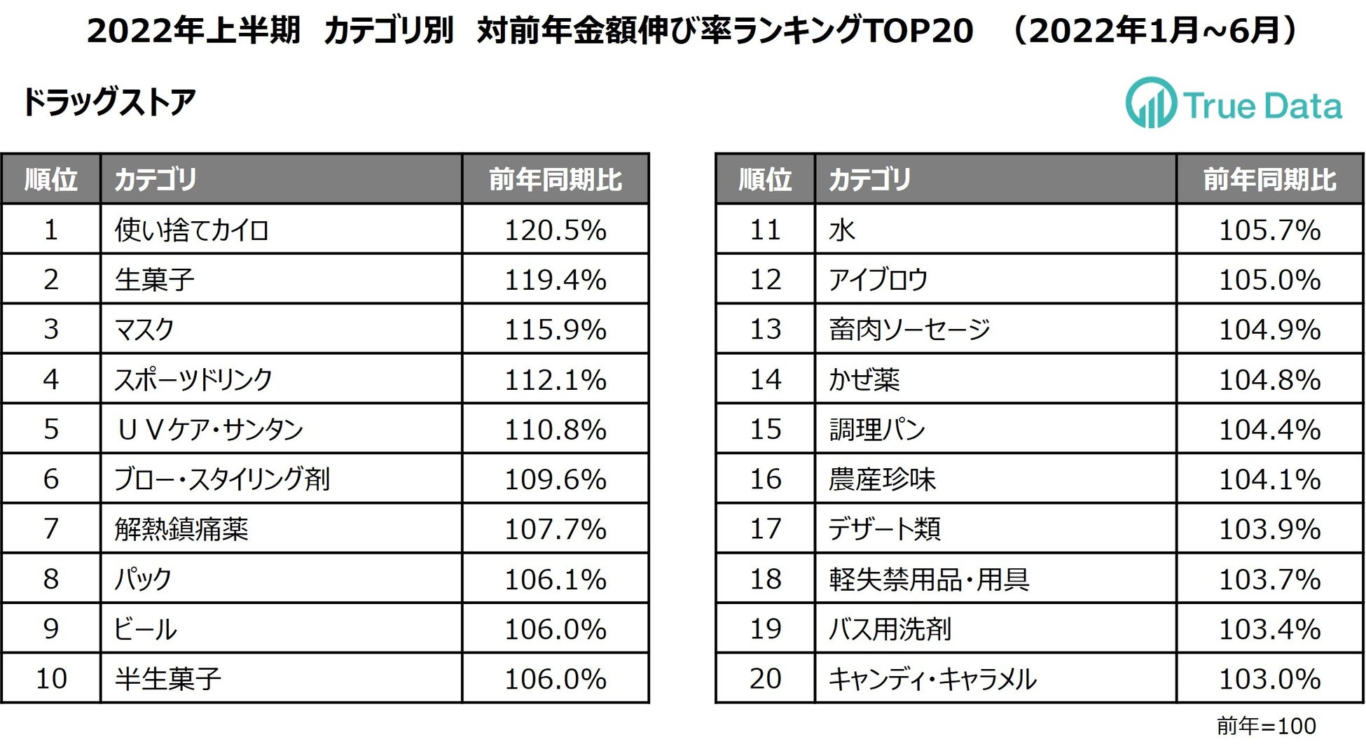 2022年1月~6月のデータを集計した上半期の「カテゴリ別 対前年金額伸び率ランキングTOP20」を発表します。前年同期に比べ最も売り上げを伸ばしたのは「使い捨てカイロ」でした。ドラッグストアで前年同期と比べ20.5%増加、食品スーパーマーケットでは同22.5%増加しました。前年に比べ冬季に冷え込みが強かったことや、外出機会が増えたことなどが売上増加に影響していると思われます。食品スーパーマーケットでは、値上げの影響か「サラダ油・天ぷら油」、「マヨネーズ」がランクインしました。