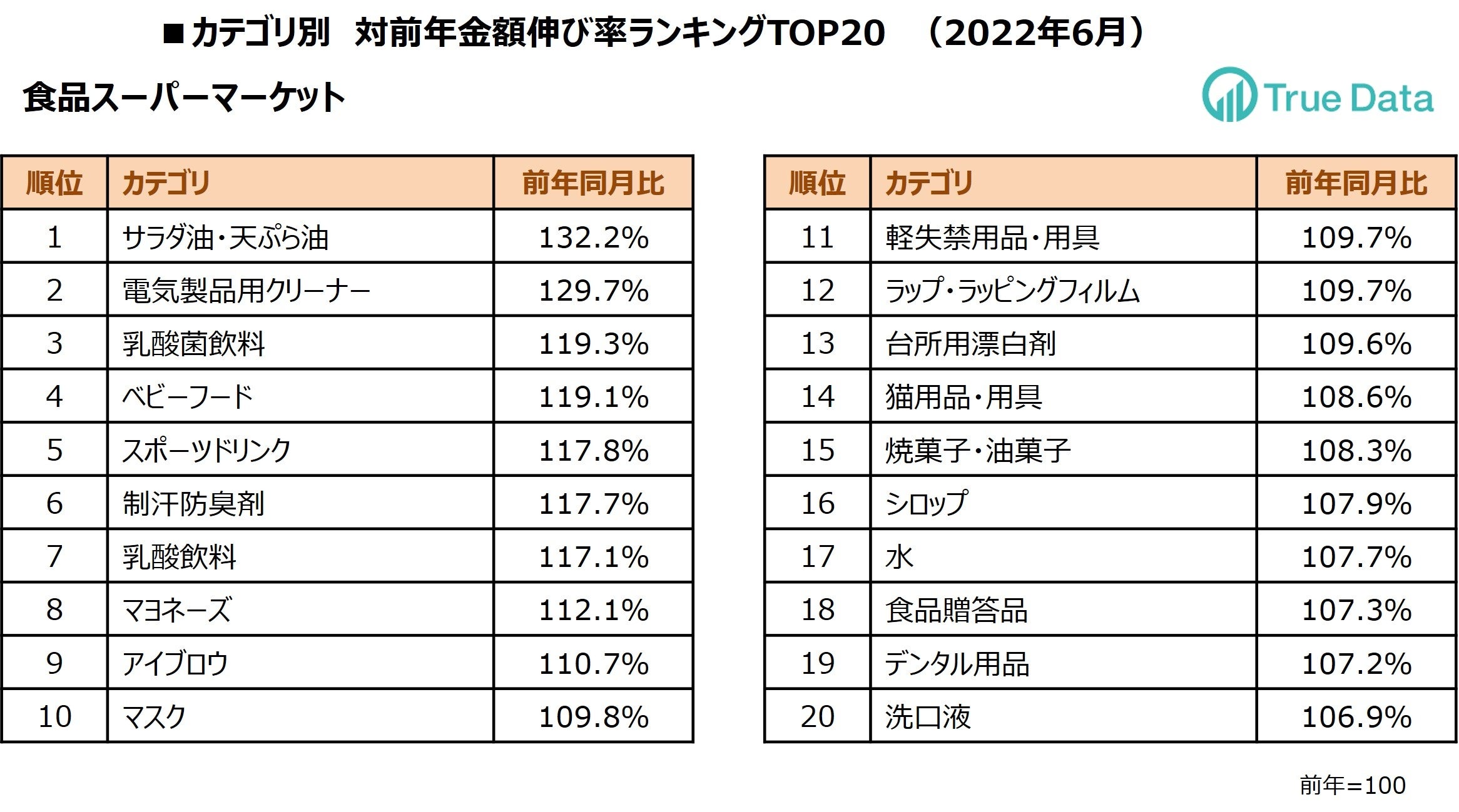 - 値上げが話題の「サラダ油・天ぷら油」の売り上げが食品スーパーマーケットで前年同月比32.2%増加、「マヨネーズ」が同12.1%増加しました。