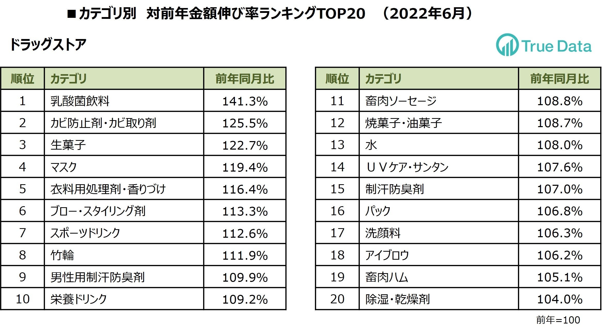 - 上記の他、ドラッグストアでは、「生菓子」、「衣料用処理剤・香りづけ」、食品スーパーマーケットでは、「電気製品用クリーナー」、「ベビーフード」などの売り上げが前年同月に比べ伸長し、カテゴリ別伸び率TOP20にランクインしました。