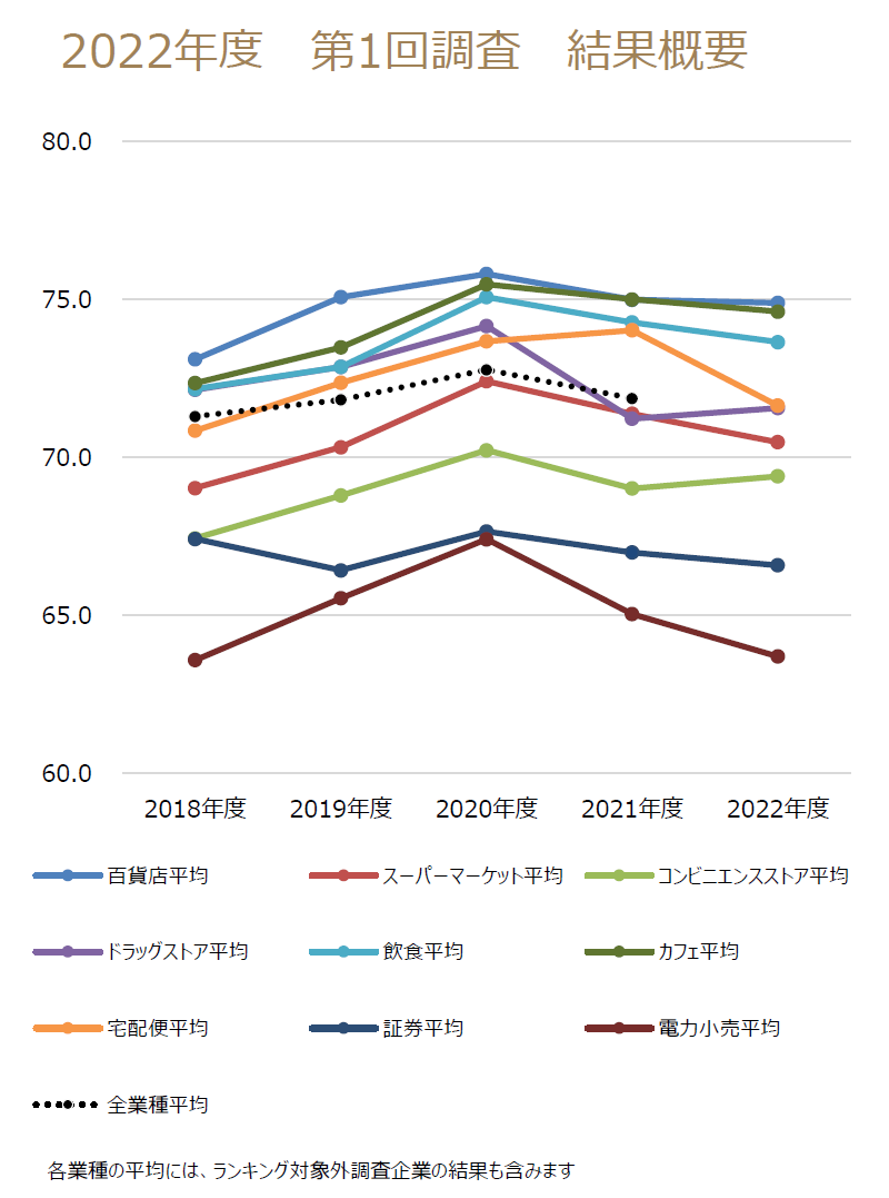 公益財団法人日本生産性本部 サービス産業生産性協議会は、2022年度JCSI(Japanese Customer Satisfaction Index:日本版顧客満足度指数)第1回調査として、9業種(百貨店、スーパーマーケット、コンビニエンスストア、ドラッグストア、飲食、カフェ、宅配便、証券、電力小売)の顧客満足度を発表しました。結果は以下の通りです。