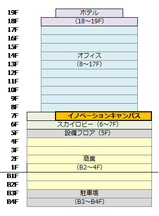 ● 当イノベーションキャンパスは、創造交差点の象徴として、本ビル内のさまざまな機能をゆるやかにつなげ、組織の枠を超えたコミュニケーションを誘発する7階のスカイロビーエリアに位置します。イノベーションキャンパスの施設構成としては、24時間365日利用可能な、プライベートオフィスやコワーキングスペース、会議室、アメニティスペース(キッチンスペース・授乳室・仮眠室など)を計画しています。