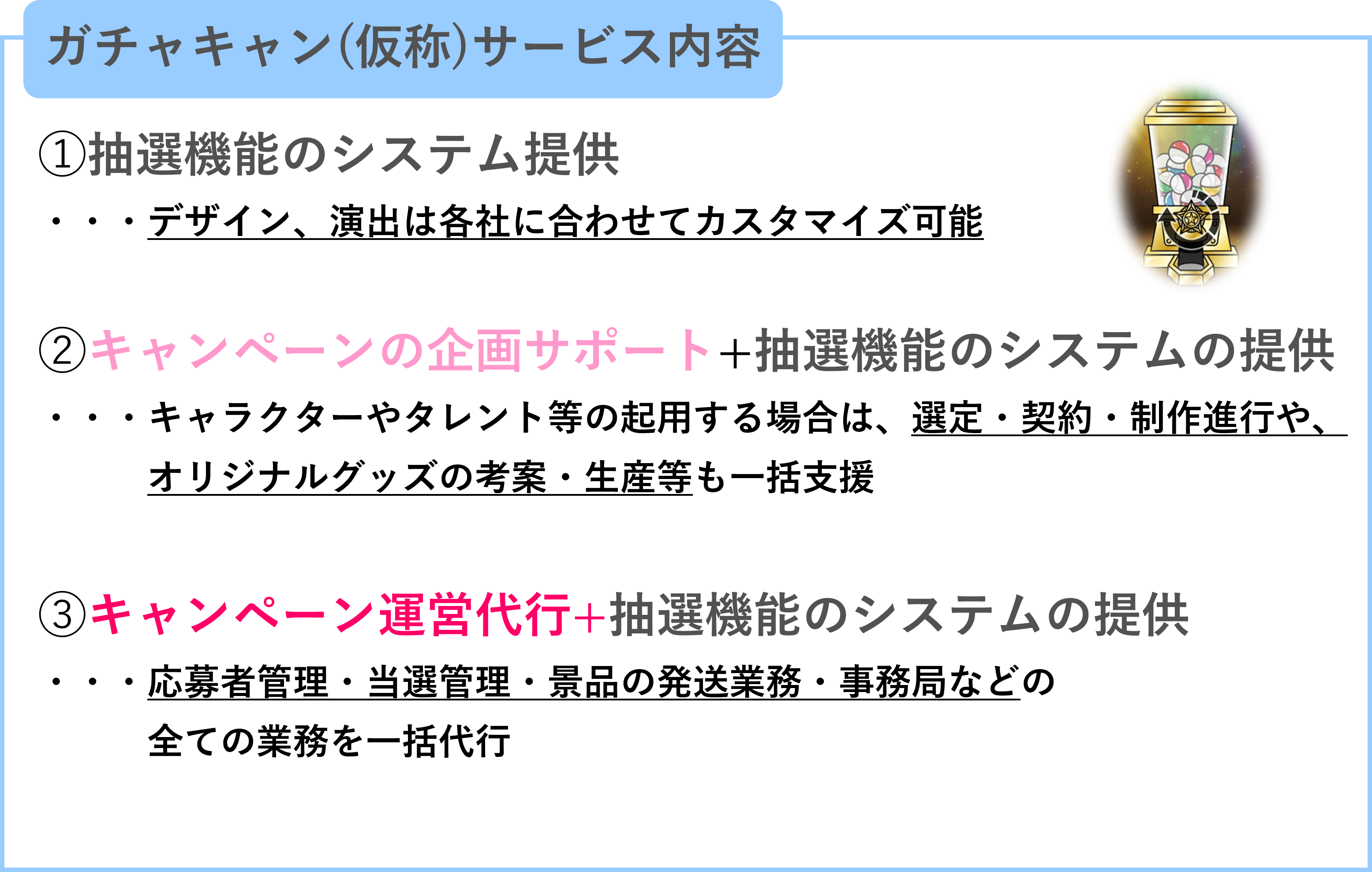 当社のガチャキャン(仮称)は、システムの提供だけでなく、これまで培ってきたマーケティングのノウハウを用いて、多種多様な企画の提案が出来ることが強みです。予算や要望に応じてプロモーションやブランド(商品)と親和性の高いキャラクターやタレント等を起用した企画など、提案から契約、制作進行、オリジナルグッズの考案~生産、配送まで一括サポートいたします。