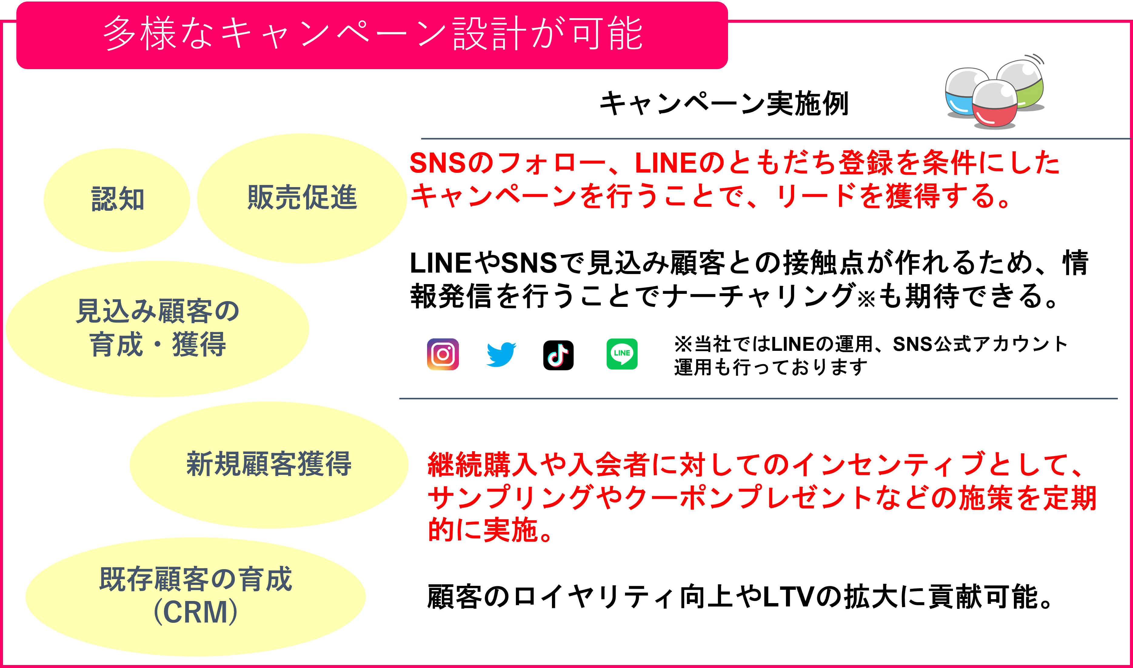 さらに、LINEの友達登録を行った人に対してキャンペーンを実施したり、キャンペーンの参加にLINEログインを利用するなどの方法により、顧客からLINE IDを提供してもらうための導線としても利用できます。顧客のLINE アカウントを把握することで、定期的な情報発信が行えるため、クロスセル・アップセルはもちろん、ファン化などの効果が想定されます。キャンペーンの実施例としては、リードの獲得やナーチャリングを目的としたSNSのフォローやLINEの友達追加を条件としたキャンペーン、購入者や入会者に向けたサンプリングやクーポンを発行するCRM施策に対応したものなどがあります。要望に応じて様々なアレンジが可能です。マストバイのクローズドキャンペーン以外にも、商品購入や、サービス利用などの条件を設けない幅広い層に向けたオープンキャンペーンを行うことも出来ます。
