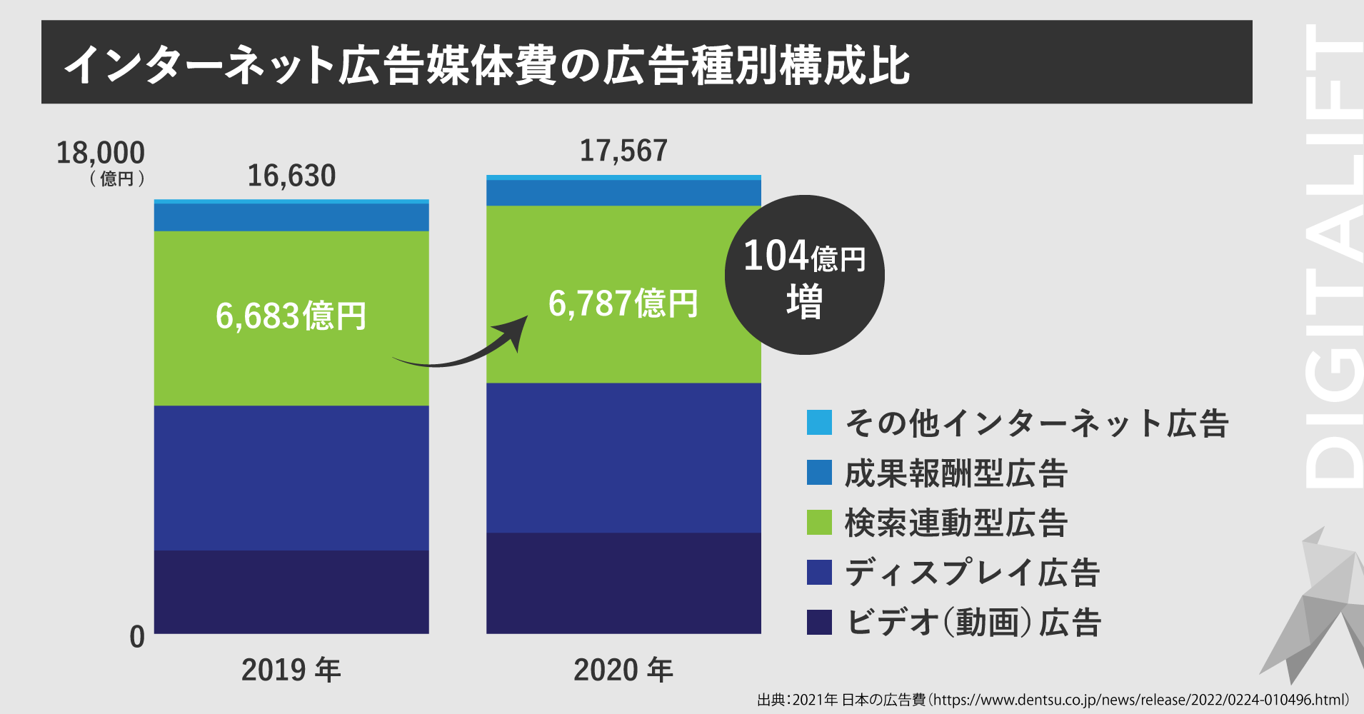 中でも、リスティング広告(検索連動型広告)は、2019年から2020年にかけて104億円増加しており、これは検索するユーザーの増加だけでなく、競合が増えている、ということが予想され、デジタリフトはリスティング広告市場での競争は今後も激化すると考えています。