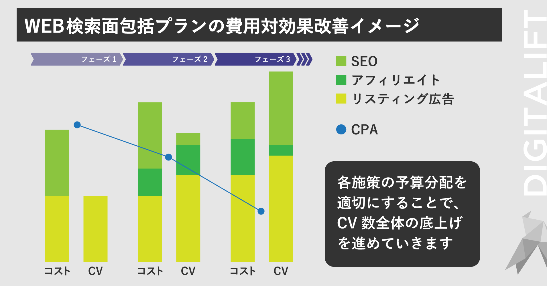 デジタリフトでは、包括的なデジタルマーケティング支援を提供するため、広告運用に限らず、アフィリエイトやSEOなどその周辺領域にも力を入れ、さらにそれぞれの専門チームが縦割りではなく、密に連携しながらクライアント支援を行う体制を整えています。今回提供する「WEB検索面包括プラン」は、連携を重視するデジタリフトならではのサービスで、リスティング広告・SEO・アフィリエイト、それぞれの強み・弱みを理解し、統合的に戦略を練るため、コスト効率が最も良い形で検索面をハックすることが可能となっています。