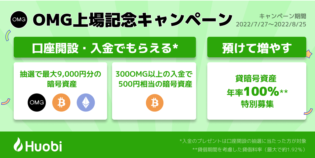 こちらを記念し、【最大9,500円が抽選でもらえる!年率100%*の貸暗号資産キャンペーンも!】OMG上場記念キャンペーンを実施いたします。ぜひご参加ください!