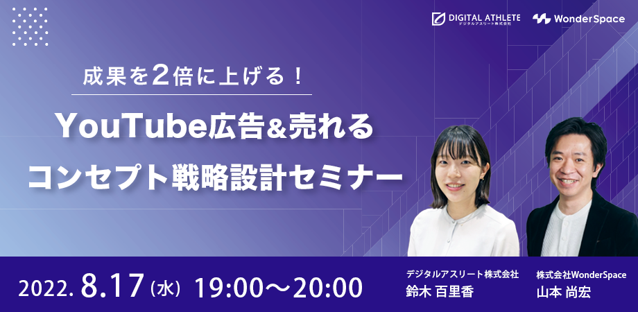 など広告運用に関しての課題を抱えている方向けに、売れるコンセプト戦略設計とそれを落とし込んだYouTube広告の制作・運用方法をお伝えすべく「すべての挑戦をさらなる高みへ」を企業理念とするデジタルアスリート株式会社様と「マーケティングの力で日本の課題を解決する」をPURPOSEとするWonderSpaceとがタッグを組み、ウェビナーを開催する運びとなりました。