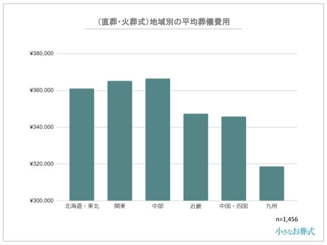 直葬・火葬式の全国平均葬儀費用は355,110円ですが、地域別に見た直葬・火葬式の平均葬儀費用は以下の通りです。