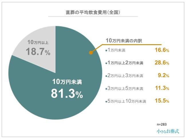 飲食にかかった費用は、全体の81.3%の人が10万円未満で用意しており、その中でも1万円以上2万円未満が1番多い結果になりました。直葬では飲食の時間を設けない場合もありますが、参列するのは基本的に同居の家族や特に親しい親族など、近い関係の親族だけです。そのため、飲食費用も人数に応じて少なくなる傾向があります。