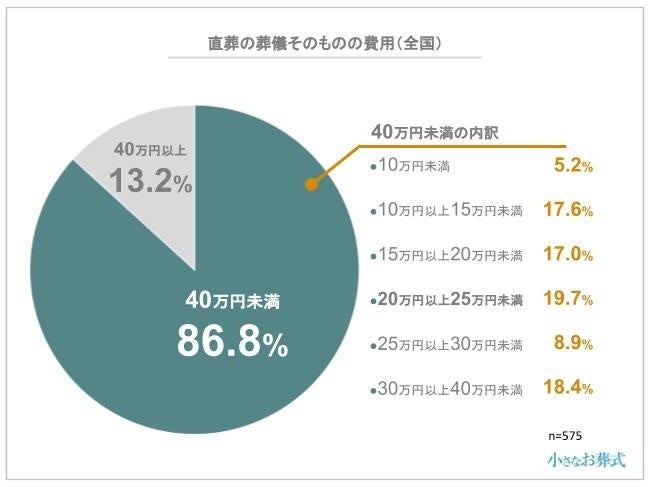葬儀そのものの費用は、40万円未満が全体の86.8%を占めており、その中でも20万円以上25万円未満が1番多いことがわかりました。一般葬、家族葬、直葬の中では唯一式を執り行わない形式のため、直葬は1番費用が抑えられます。ただし、10万円未満が5.2%で少数という結果から、直葬でも基本的に10万円以上必要になることが多いようです。