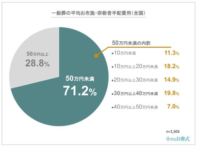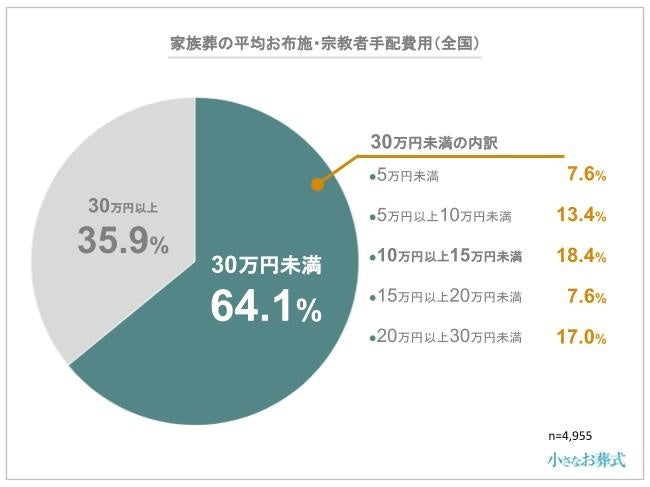 お布施・宗教者手配費用は、30万円未満が64.1%を占め、その中でも10万円以上15万円未満が最も多く、次いで20万円以上30万円未満が17.0%、3番目に5万円以上10万円未満が13.4%ということがわかりました。