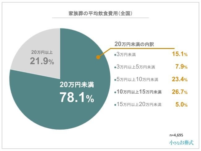 飲食にかかった費用は、全体の78.1%の人が20万円未満で準備しており、その中でも10万円以上15万円未満が1番多い結果になりました。家族葬では参列者が少ない分、用意する食事の数が少なくなることも、20万円未満が多いという結果の理由として考えられるでしょう。