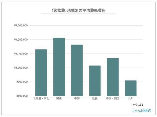 家族葬の全国平均葬儀費用は1,096,986円ですが、地域別に見た家族葬の平均葬儀費用は以下の通りです。