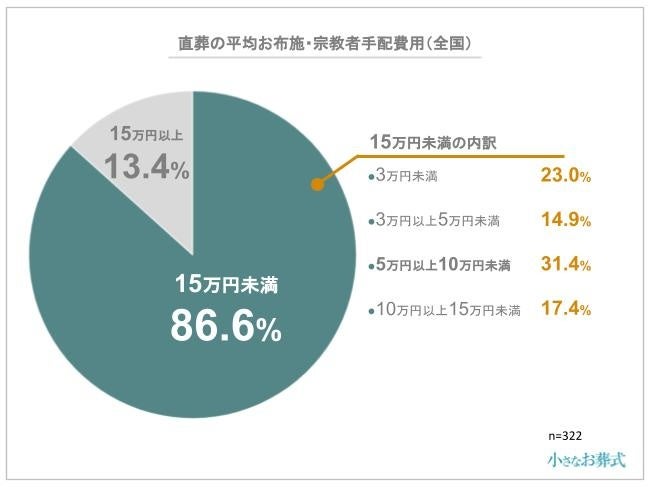 お布施・宗教者手配費用は、15万円未満が86.6%を占め、その中でも5万円以上10万円未満が1番多いことがわかりました。直葬は通夜や告別式の読経の必要がないため、火葬場での読経や戒名授与のみであることが多いでしょう。そのため、家族葬や一般葬などの葬儀と比べてお布施が比較的少額になる傾向があります。
