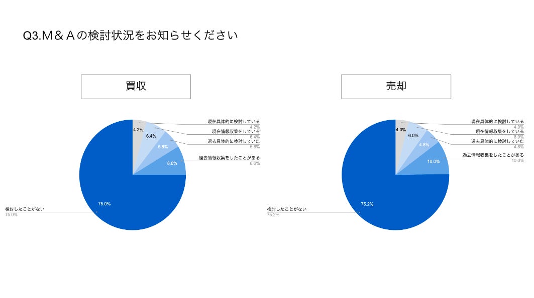 M&Aの検討状況として、「検討したことがない」が75%を超え、後継者不在や事業継承を重要な課題として挙げているものの、ほとんどの経営者がM&Aを検討したことがないという結果になりました。