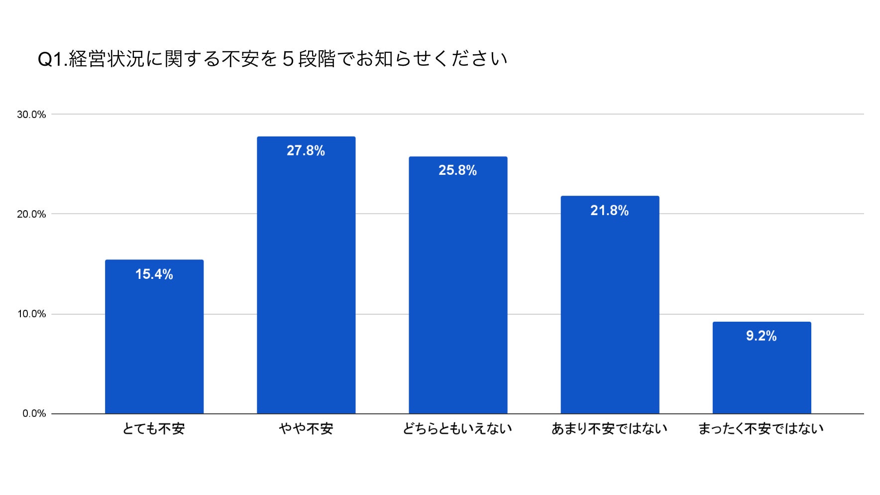 経営状況に関して、「とても不安」が15.4%、「やや不安」が27.8%、「あまり不安ではない」が21.8%、「全く不安ではない」が9.2%という結果になりました。多くの経営者が経営状況に不安を感じていますが、具体的にどのような課題を感じているのでしょうか?