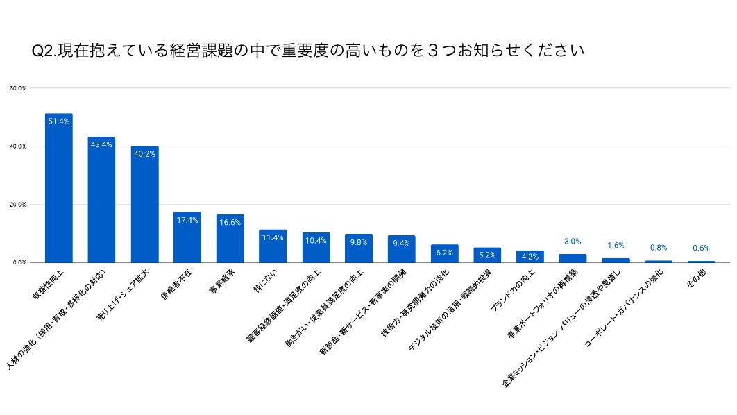経営課題の中で重要度の高いものとして、「収益性向上」が51.4%、「人材の強化」が43.4%、「売り上げ・シェア拡大」が40.2%という結果になりました。